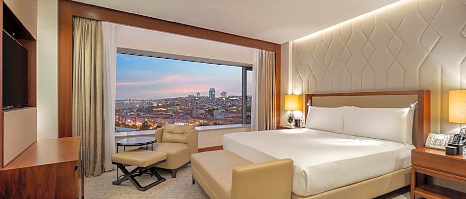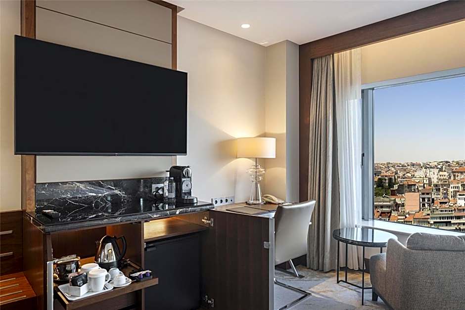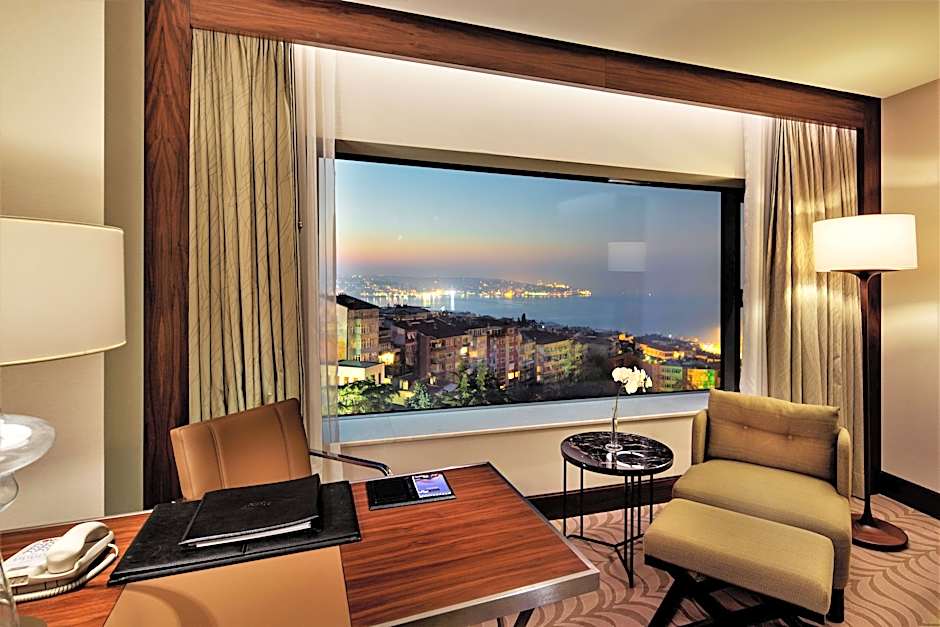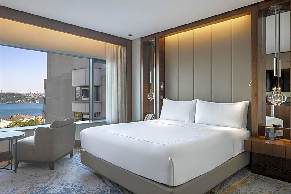 This stylish Deluxe King Room includes a range of modern amenities including an LCD TV with multinational channels, iHome dock station, free WiFi and a coffee machine. It also offers stunning partial Bosphorus view. Room has large double-aspect windows, a work desk, feather and down pillows, and 300-thread-count sheets. The marble bathroom comes with luxury bath amenities The marble bathroom comes with luxury bath amenities as Byredo. Complimentary WiFi throughout the hotel • Concierge service • Daily turn-down service