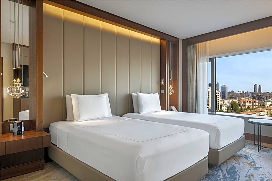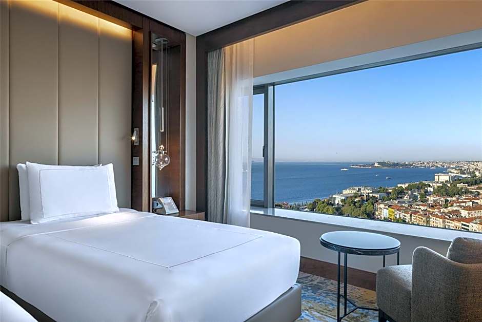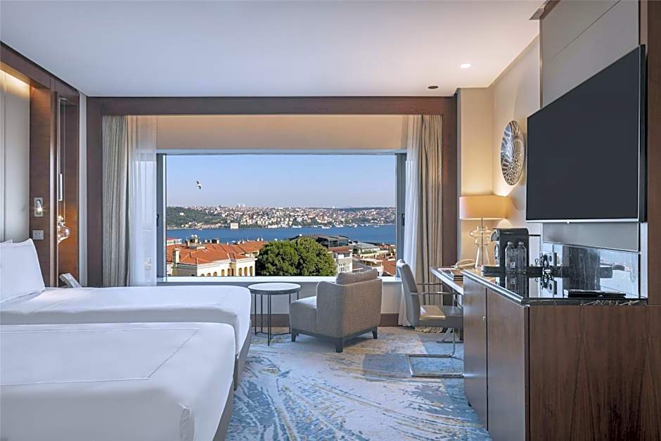 This stylish Deluxe Twin Room includes a range of modern amenities including an LCD TV with multinational channels, iHome dock station, free WiFi and a coffee machine. It also offers a stunning partial Bosphorus view. Room has large double-aspect windows, a work desk, feather and down pillows, and 300-thread-count sheets. The marble bathroom comes with luxury bath amenities. The marble bathroom comes with luxury bath amenities as Byredo.Complimentary WiFi throughout the hotel • Concierge service • Daily turn-down service